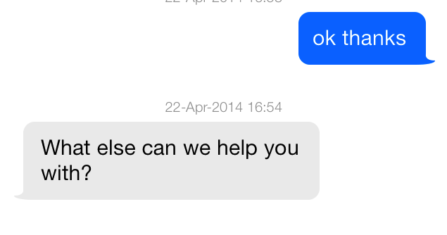 | Thanks for contacting us. | Text for alertview when customer is dropped back to app after starting a conversation ![]() |