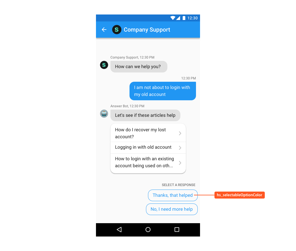 | hs__selectableOptionColor | Color of the text in option pills of QuickSearch Bot or skip button. Color of the jump to latest message icon. |