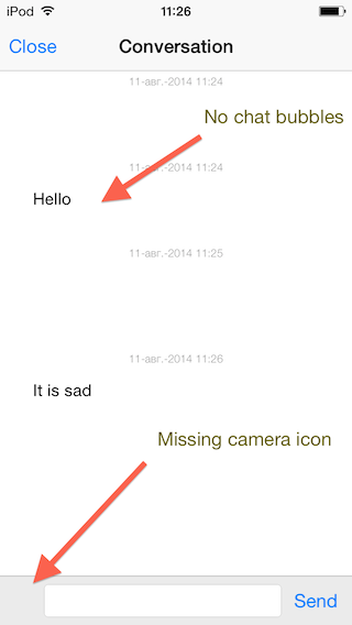If you encounter a conversation screen, where the chat bubbles are missing, or camera icon is missing, then make sure to correctly import the png files from the HSResources folder into your project.