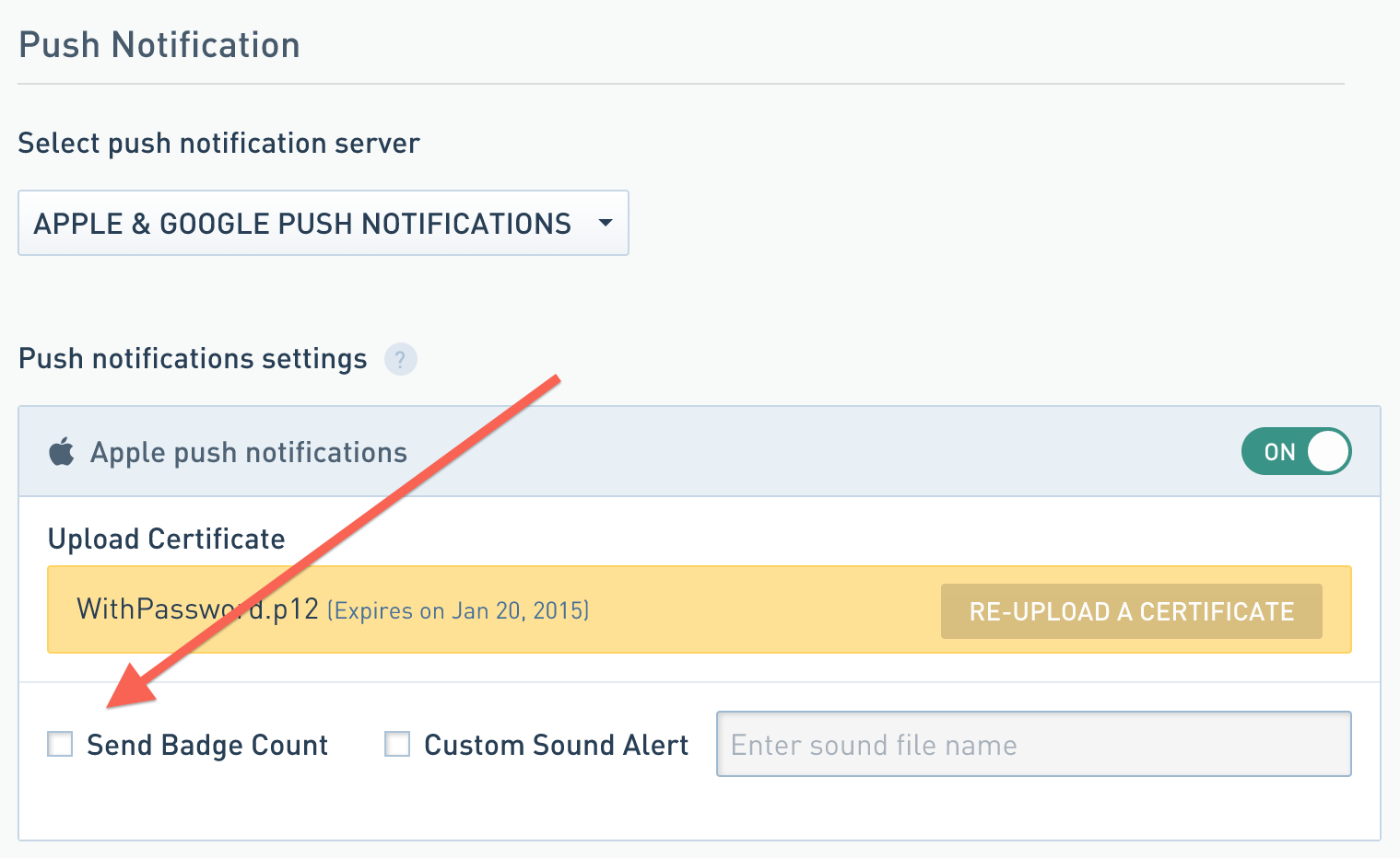 • If custom sound alerts are not working, make sure that Custom Sound Alert is selected under App Settings > Push Notifications. Also, provide the sound file name (with the file extension) exactly as the file name used in your app.