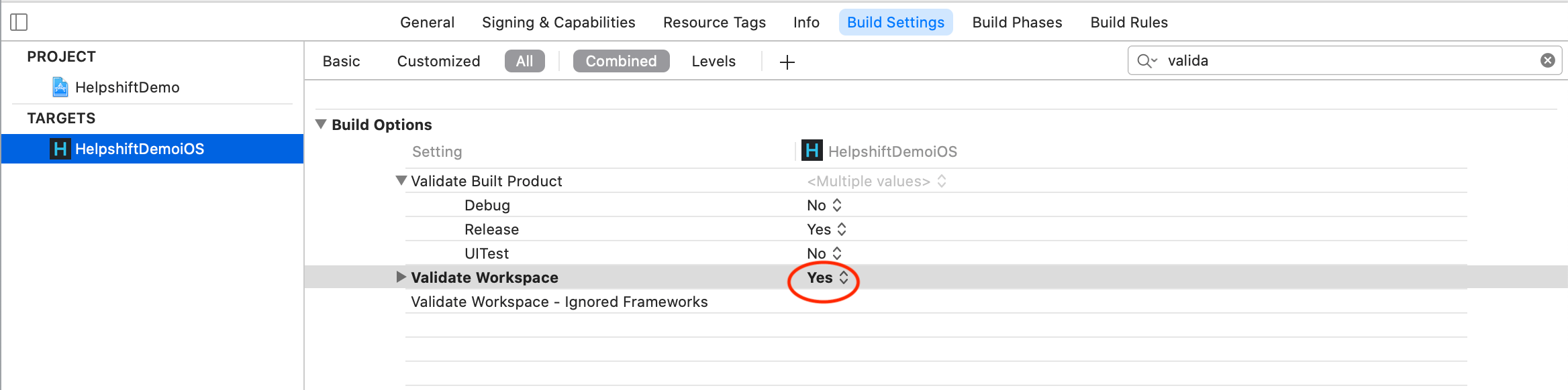 Workaround : Under Build Settings - Navigate to Validate Workspace - Toggle setting back to Yes/No but not to Yes (Error).