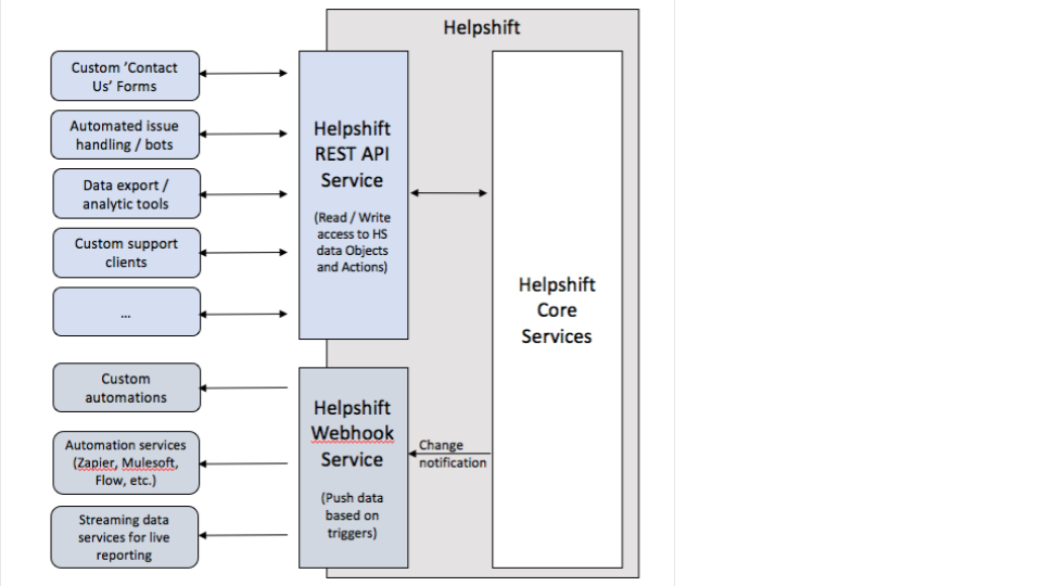 • The REST API service which will enable read/write access into the core Helpshift objects, and access to perform Helpshift actions.