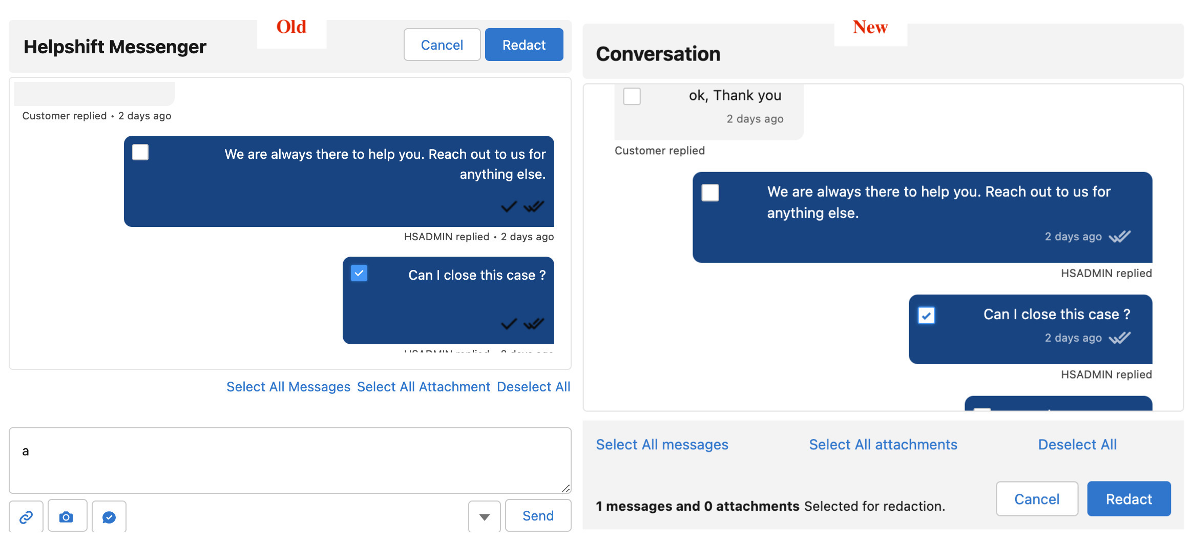 3. The old experience will be available too. If the new messenger or any admin functionality doesn’t work as per your expectations, or you do not like the new experience, you can switch back to the old experience. Please provide feedback to Helpshift Support on reasons to switch back.