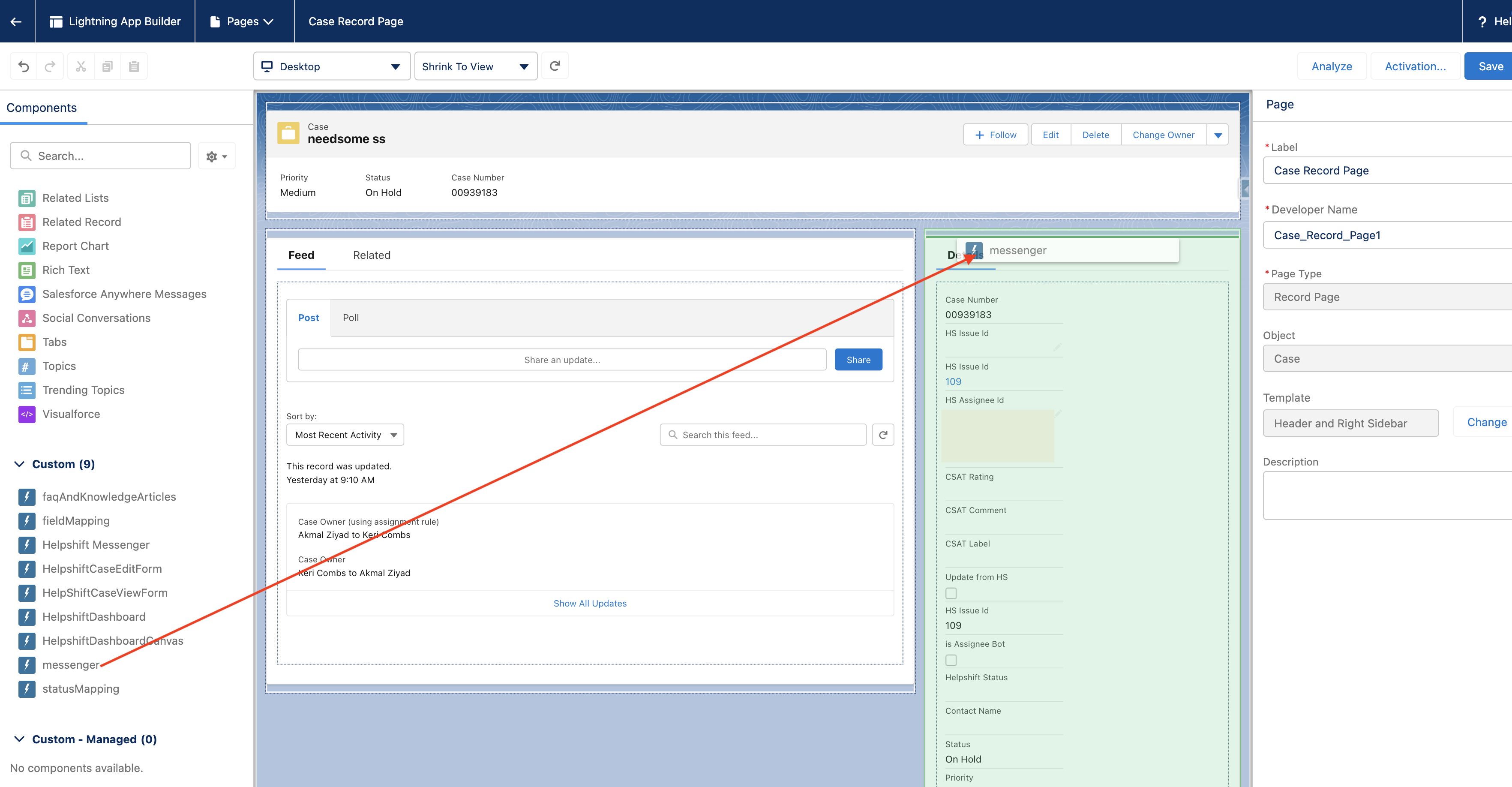 - Manually add the new Helpshift Messenger to the case record page. (Steps for this are described in the next section.)