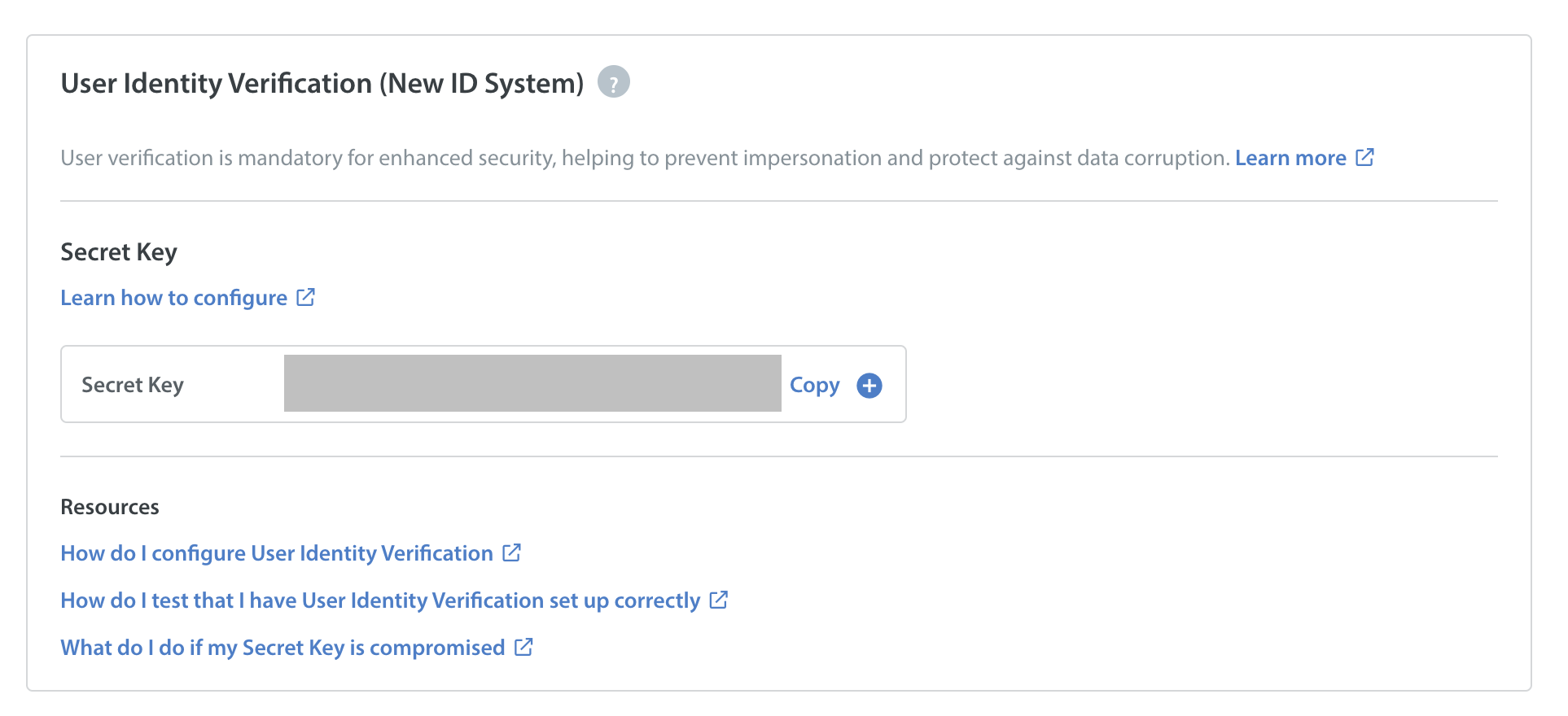 Ensure that you have the secret key from Helpshift Dashboard. The secret key can be generated from the “User Identity Verification (New ID System)” section of your app’s settings.