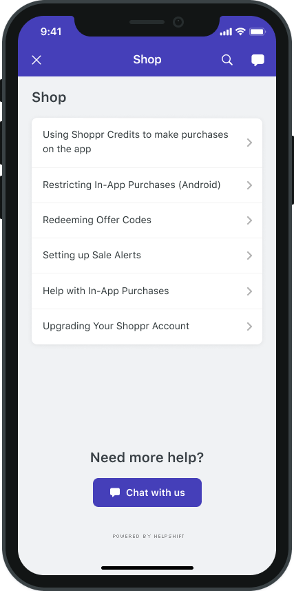 You can use the API call showFAQsWithConfig: to provide a way for the user to invoke the purpose-built help/support section in your app. This is the easiest approach to enable help in your app as it bundles all the capabilities of the Helpshift SDK in a simple and intuitive interface. You can wire this API call to a "Help" or "Support" action in your app.